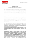 Manifiesto del 脕rea P煤blica de CCOO para el acto del 19 de noviembre en defensa de los servicios p煤blicos, el que representantes sindicales, venidos de todas las comunidades aut贸nomas, reivindicar谩n la importancia de los servicios p煤blicos para conseguir un Estado de Bienestar robusto y una sociedad m谩s justa y equitativa.