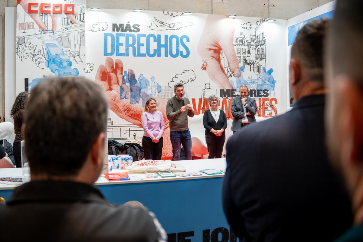El miércoles 21 de enero se inauguró el stand, con la presencia de nuestro secretario general, Lucho Palazzo Gallo, que pidió un minuto de silencio al inicio de su intervención por las víctimas mortales y las personas heridas en los accidentes ferroviarios de Adamuz (Córdoba) y Barcelona. En su breve discurso, recordó que las y los trabajadores a los que representa la federación "somos los que garantizamos que quienes atienden al turismo lo hagan con buenas condiciones y salarios" y el sindicato "tiene que exigir un turismo sostenible, que el tensionamiento que produce no afecte a los servicios públicos esenciales de la ciudadanía".